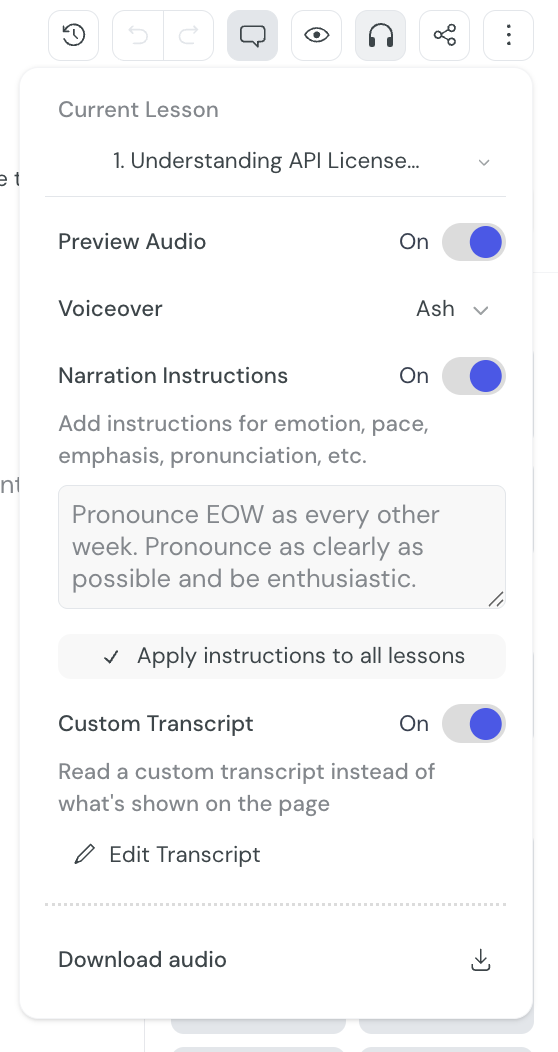 Edit the transcription used for the lesson. You can add, edit and remove wording to provide a superior experience for learners using audio-only learning methods.