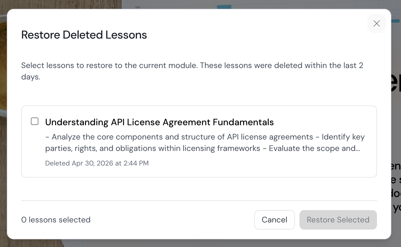 4. In the Restore Deleted Lessons dialog, select the lessons you want to recover.