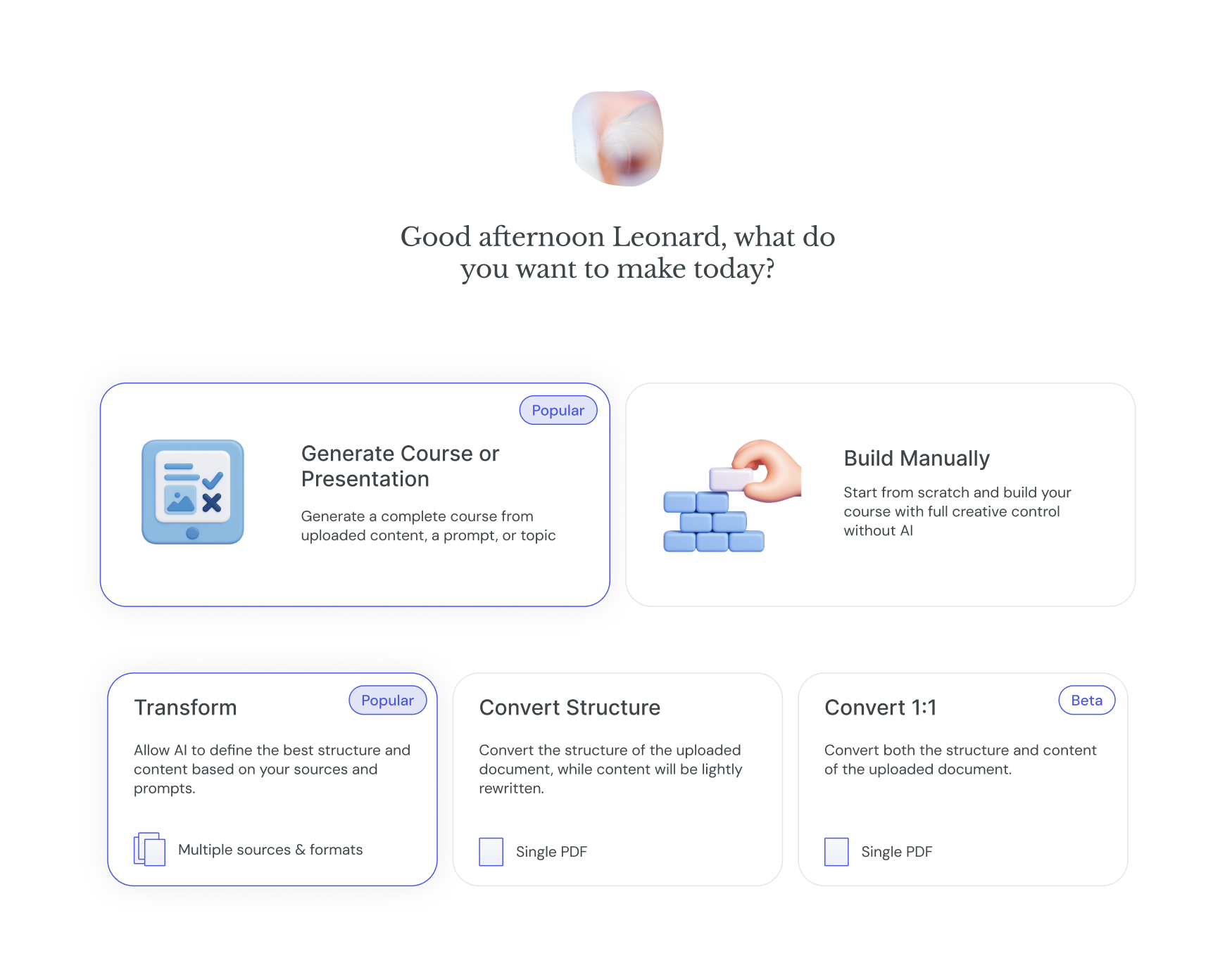 When you create a course in Courseau, you have the flexibility to choose how much AI influence you want in the final output. Whether you need a carbon copy of a PDF or a complete pedagogical overhaul, our three conversion modes have you covered.