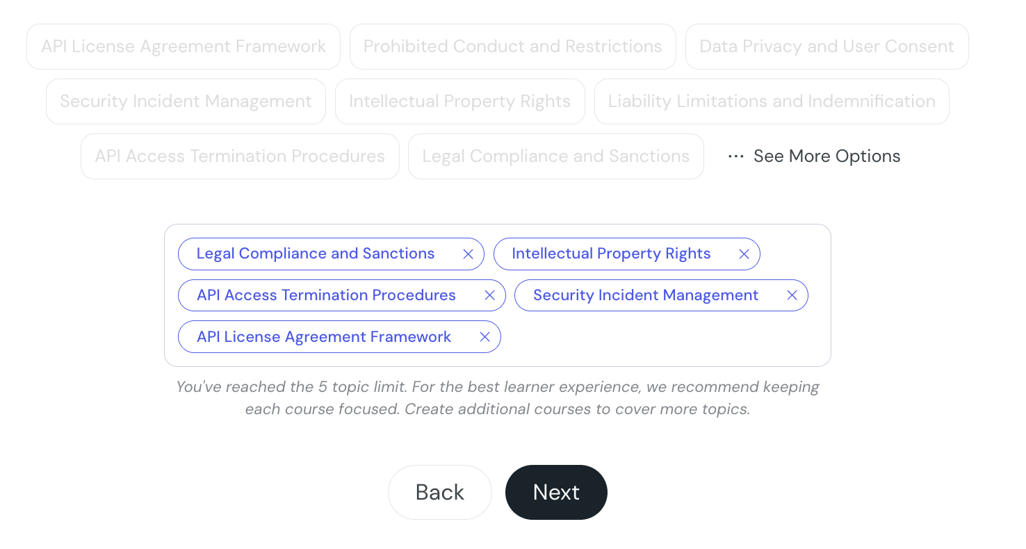 You can add up to 5 topics per course. Once the limit is reached, the input field is hidden and a message explains: "You've reached the 5 topic limit. For the best learner experience, we recommend keeping each course focused. Create additional courses to cover more topics." The AI-suggested topic buttons are also disabled when the limit is reached.