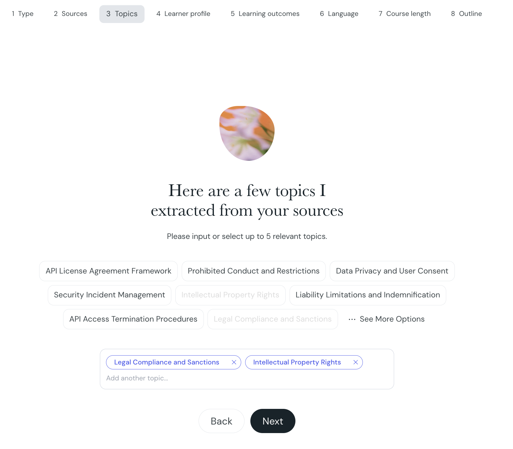 This feature appears in the step of the course creation wizard, directly below the AI-suggested topics. If you've uploaded sources, Courseau will extract and suggest topics automatically, selecting a suggestion adds it directly as a pill.