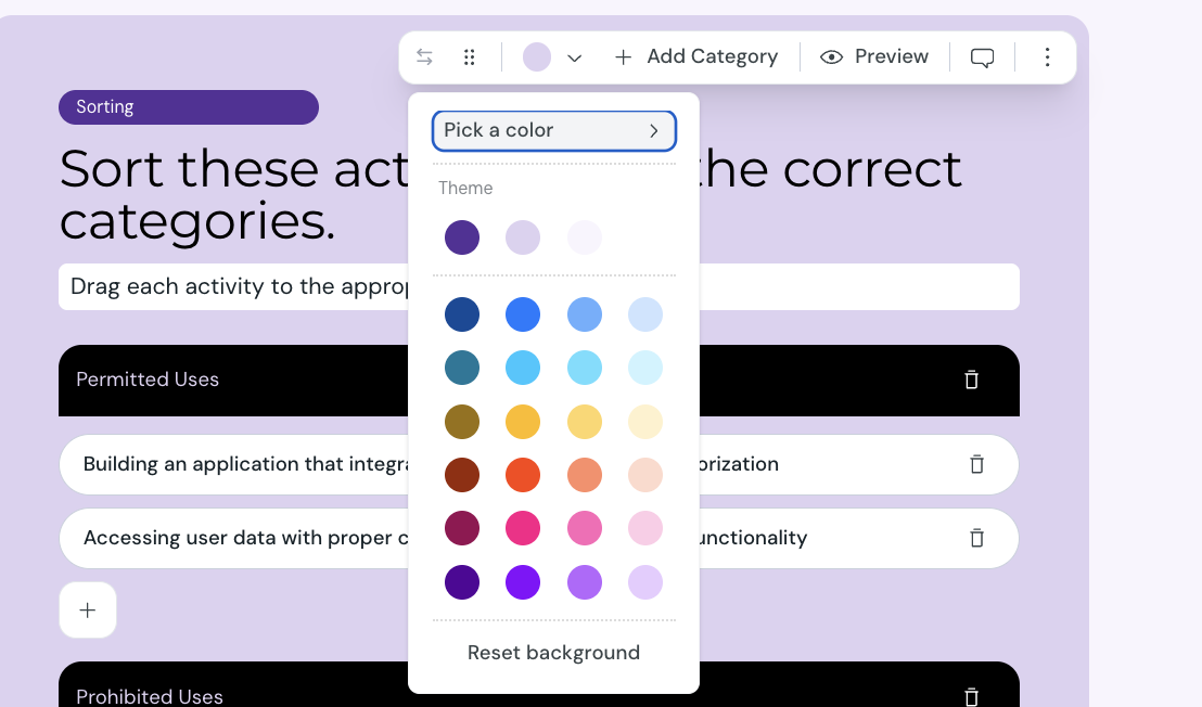 You can change the background color of the sorting quiz to match your course design.