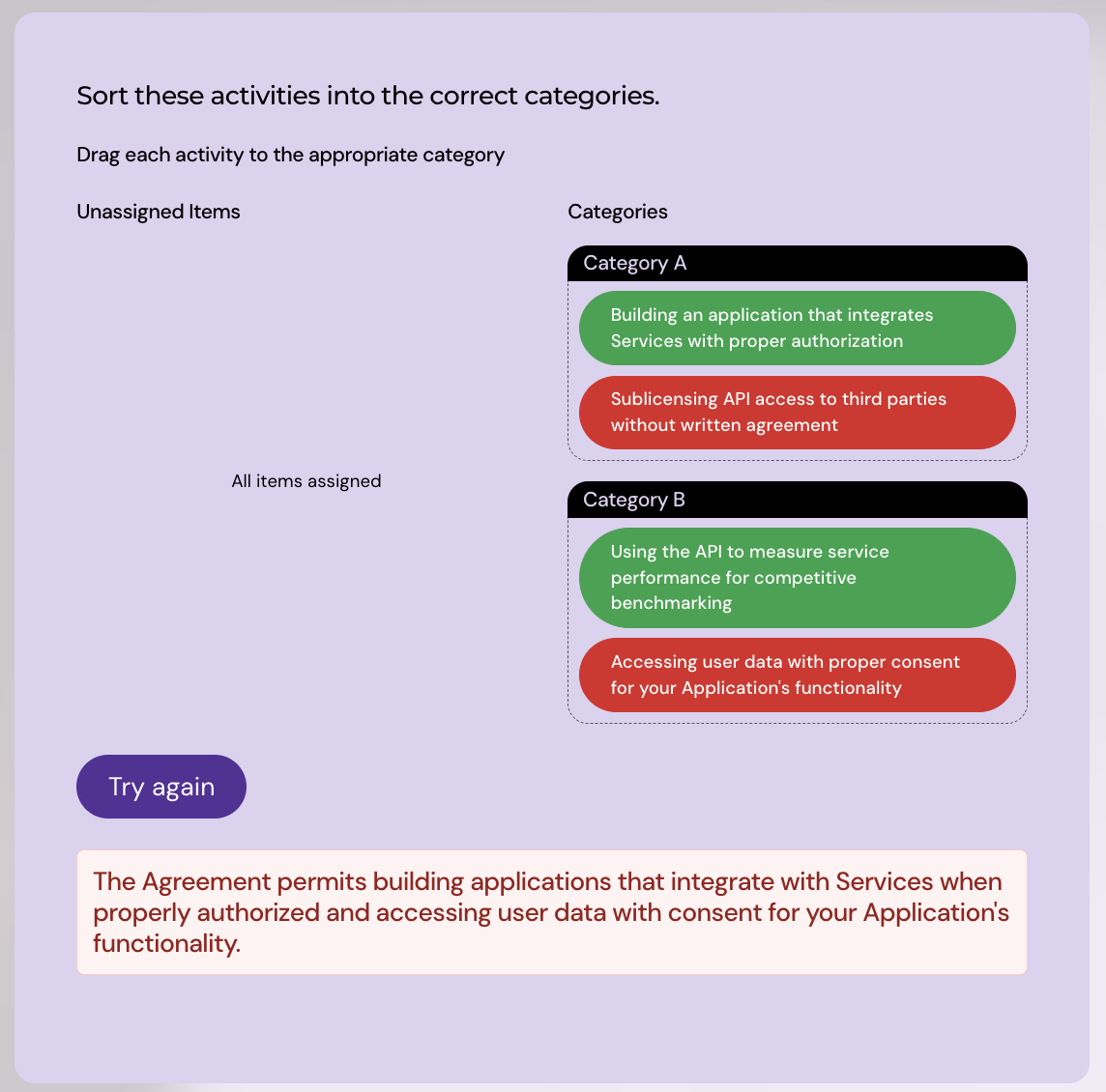 The order of items and categories is shuffled each time a learner opens the quiz. This prevents learners from memorizing positions.