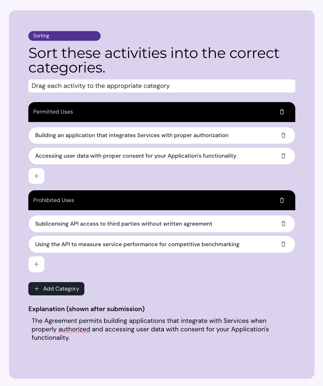 A sorting quiz presents learners with a set of items to drag and drop into the correct categories. Use sorting quizzes to test whether learners can classify, group, or organize concepts covered in your course.