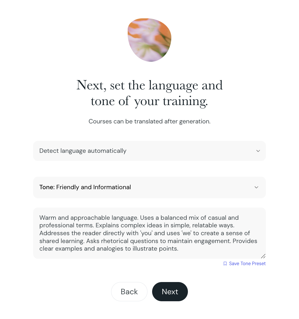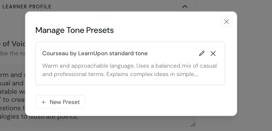 A tone of voice preset is a saved description that tells Courseau how to write your course content. Courseau passes the preset to the AI that generates lessons, so the output matches the style you want.