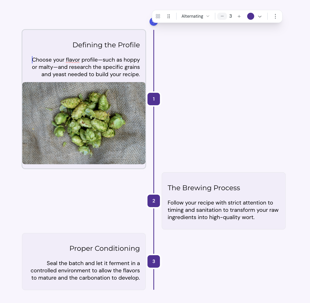 On large screens, Alternating places a vertical line down the center of the block. Numbered badges sit on the line, and each item's content appears to the left or right in turn. The result is a zig-zag rhythm that draws the eye down the page.