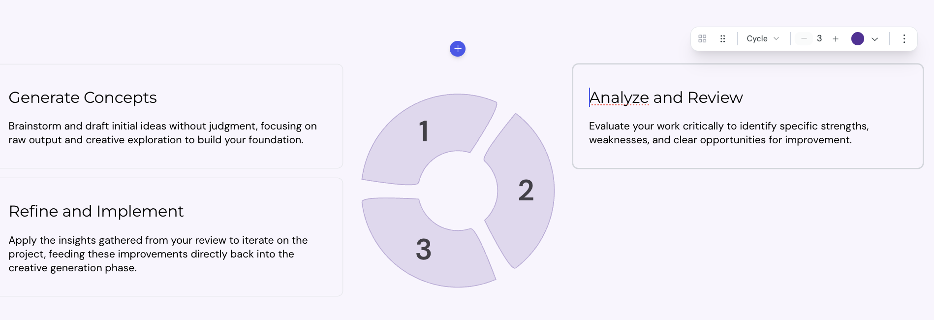 The editor adds a Cycle with 3 segments. Each segment starts with a placeholder heading and description.